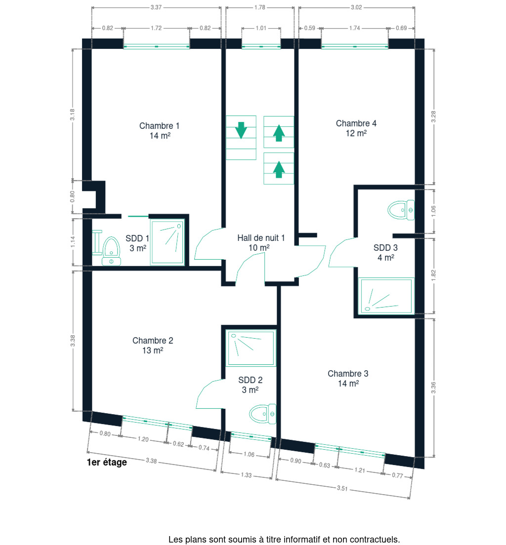 1er étage : hall de nuit desservant quatre belles chambres à coucher et 3 salle de bains en cours de finitions