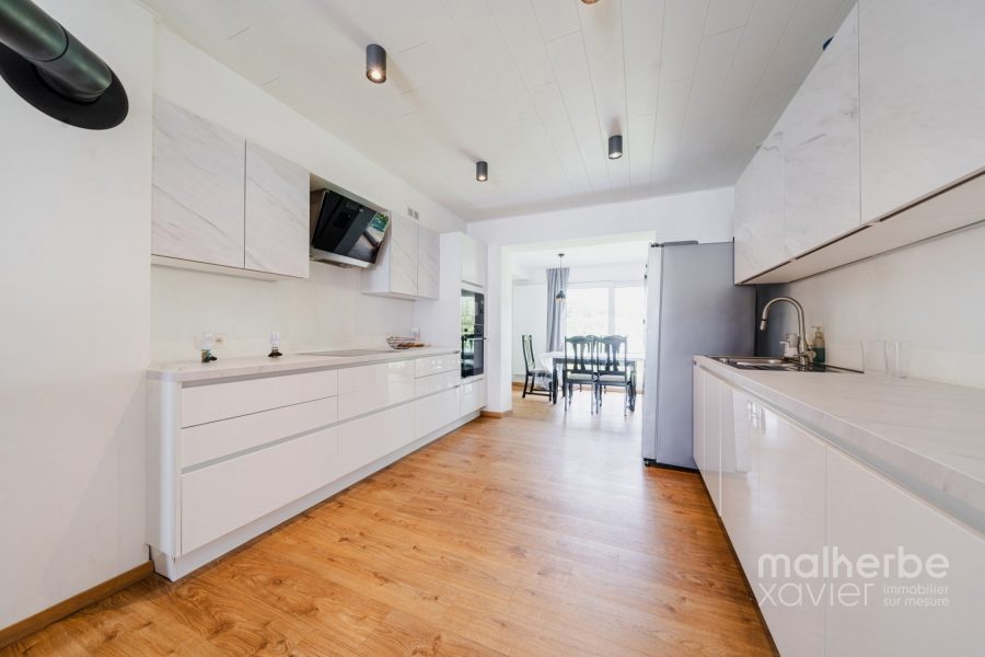 Rez-de-chaussée : vaste hall d’entrée, superbe living traversant très lumineux avec cuisine hyper équipée centrale avec espace repas, bureau, wc et garage