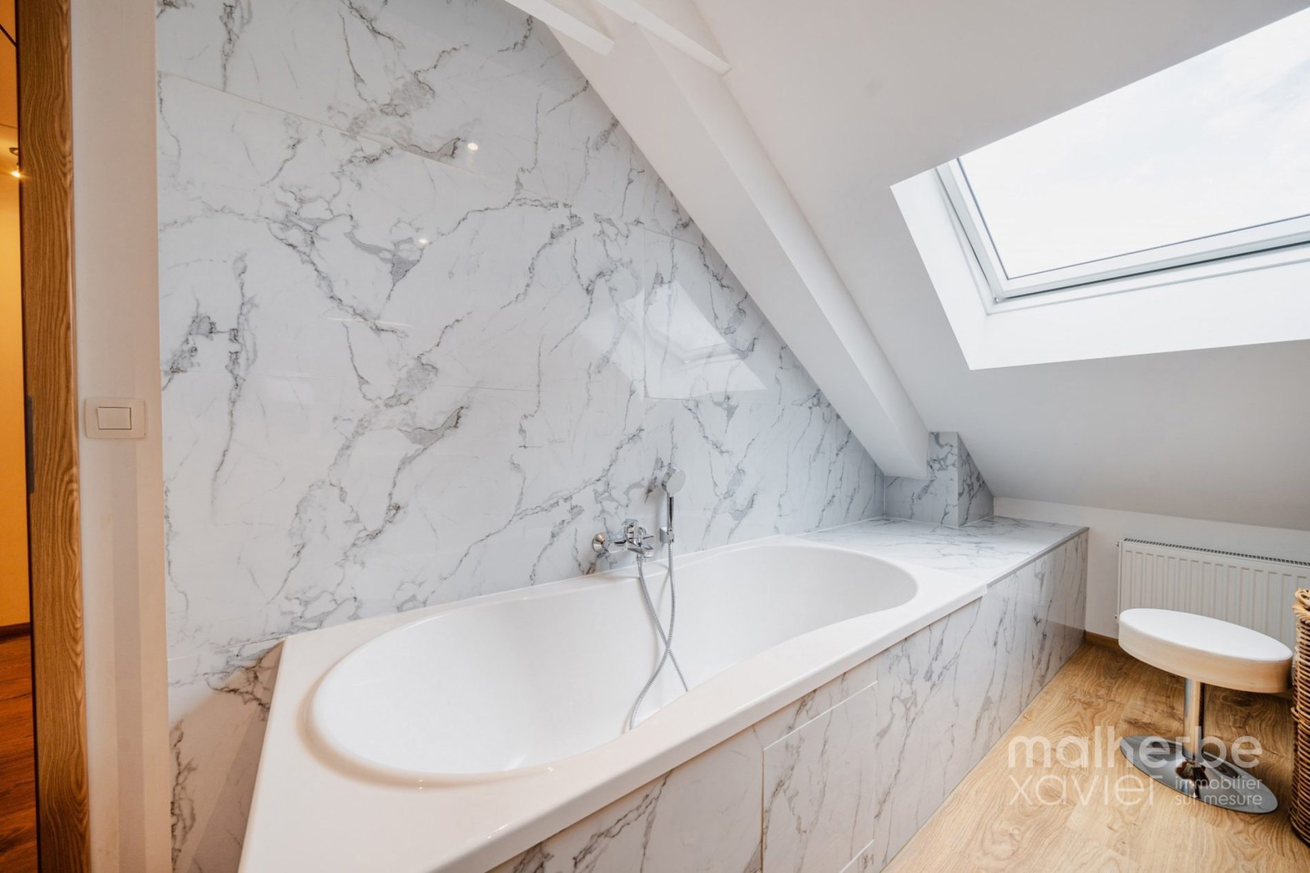 – Salle de bains 2e étage : bain, grande douche à l’italienne, meuble laqué noir double évier avec miroir éclairé, wc