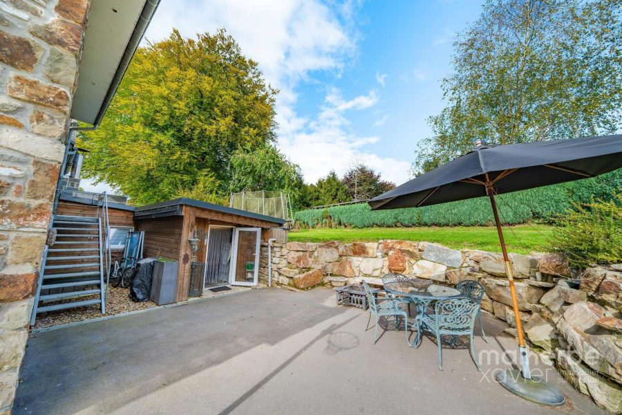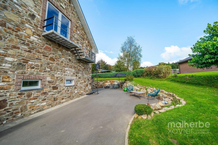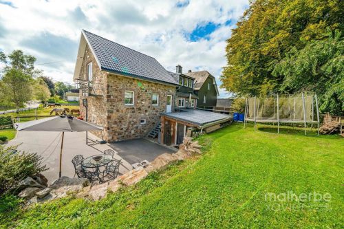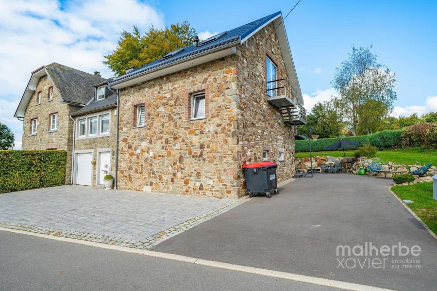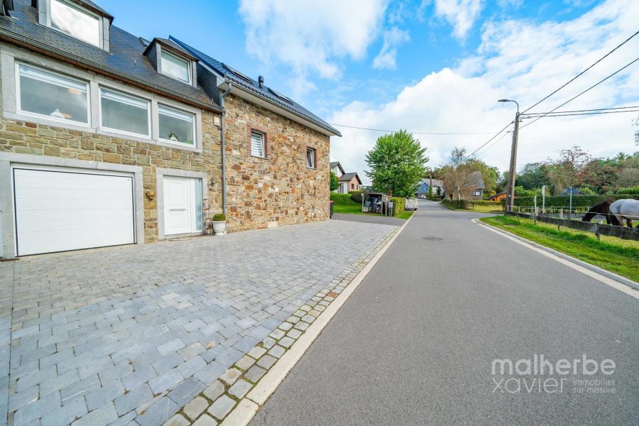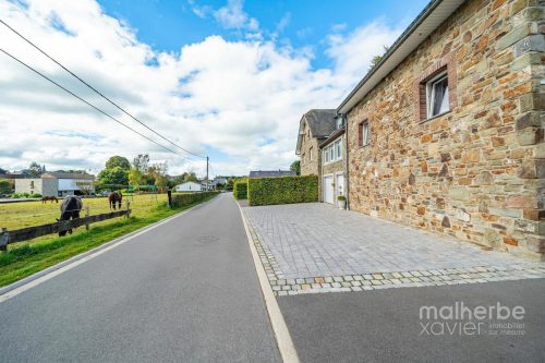 Maison d’exception 3 façades en pierre du pays à Faymonville (commune de Waimes), dans un cadre de vie exceptionnel au cœur d’un village rural, proche des Hautes Fagnes, du Lac de Robertville et du Lac de Bütgenbach, des sites touristiques prisés pour la nature et les activités de plein air.