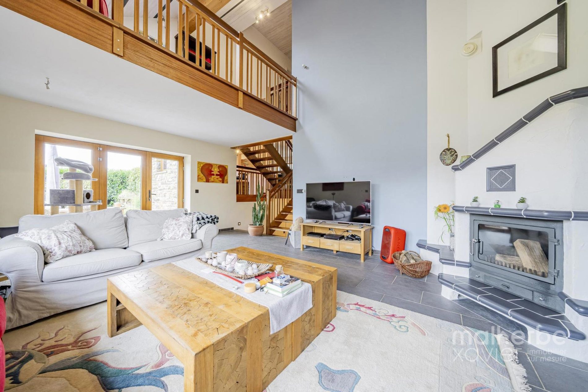 - Espaces de vie : magnifique living (plafond cathédral) avec poêle à bois, salle à manger ouverte, cuisine entièrement équipée avec finitions haut de gamme (placée en 2023)