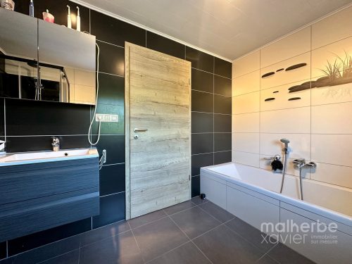 – Salle de bains équipée carrelée sol et mur : bain et douche, double éviers avec miroir intégré