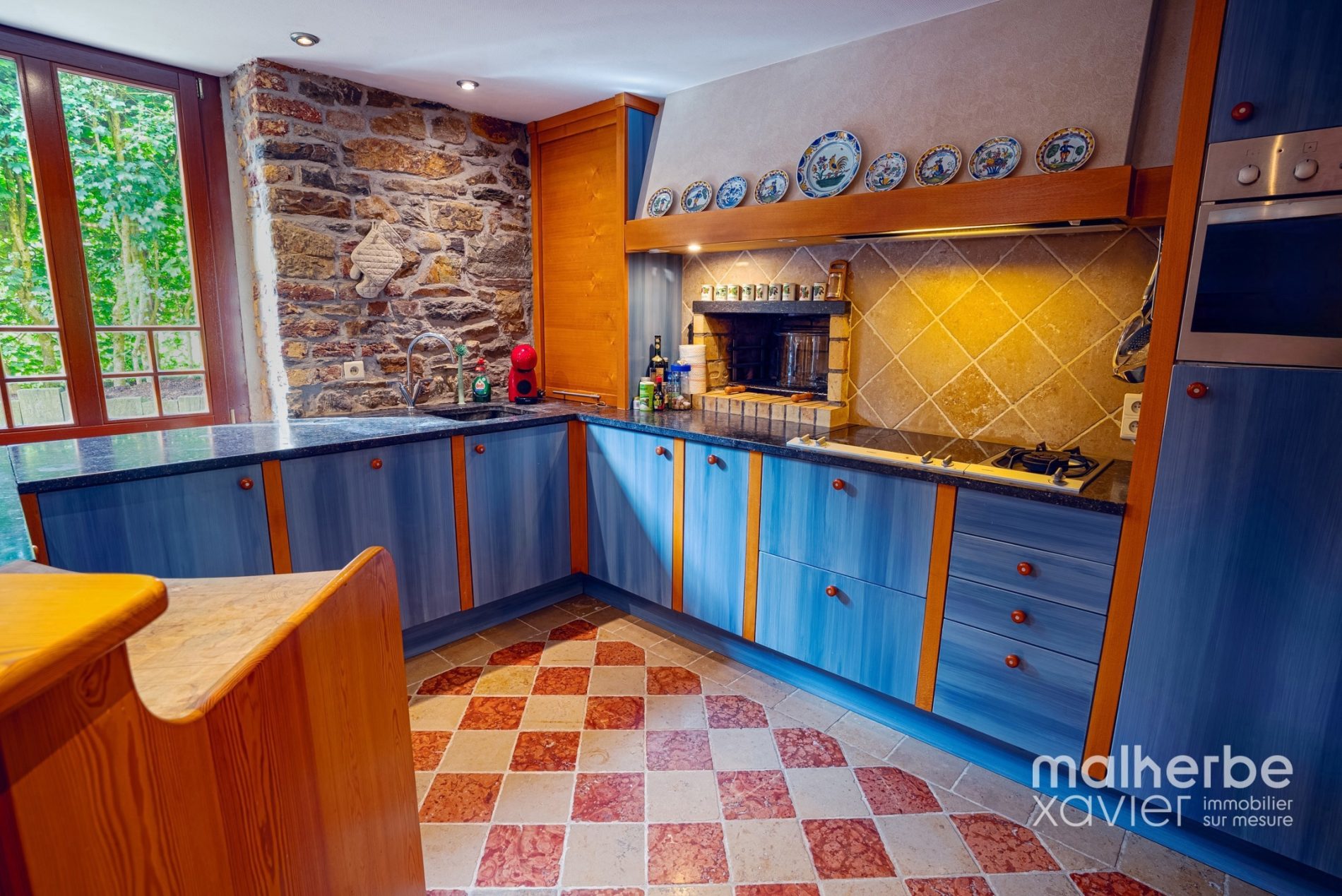 – Poêle Tulikivi en stéatite dans le living & barbecue intérieur au feu de bois dans la cuisine
