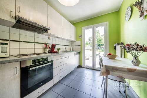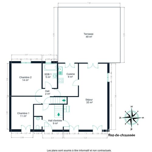 Le rez-de-chaussée comprend un hall d’entrée, un lumineux séjour de 33 m² avec accès terrasse et jardin, une cuisine équipée (Siemens, Bosch, Miele, Whirlpool), 2 chambres, une salle de bains et un WC séparé.