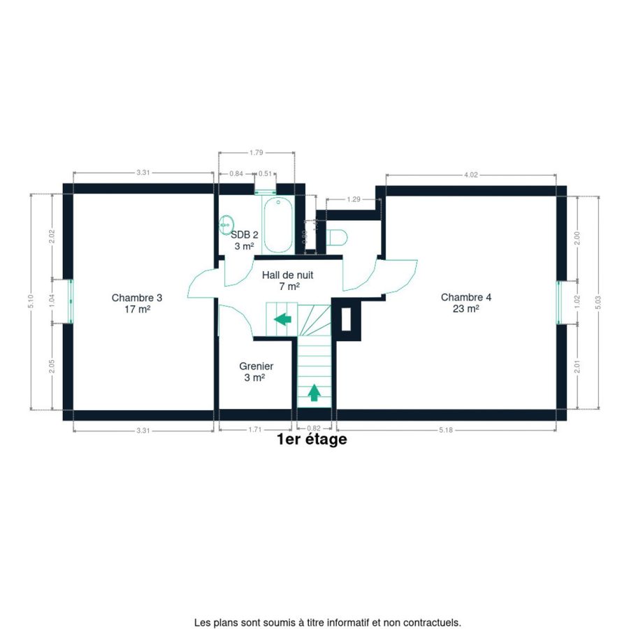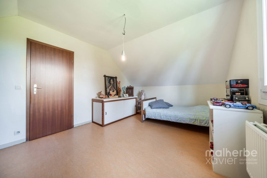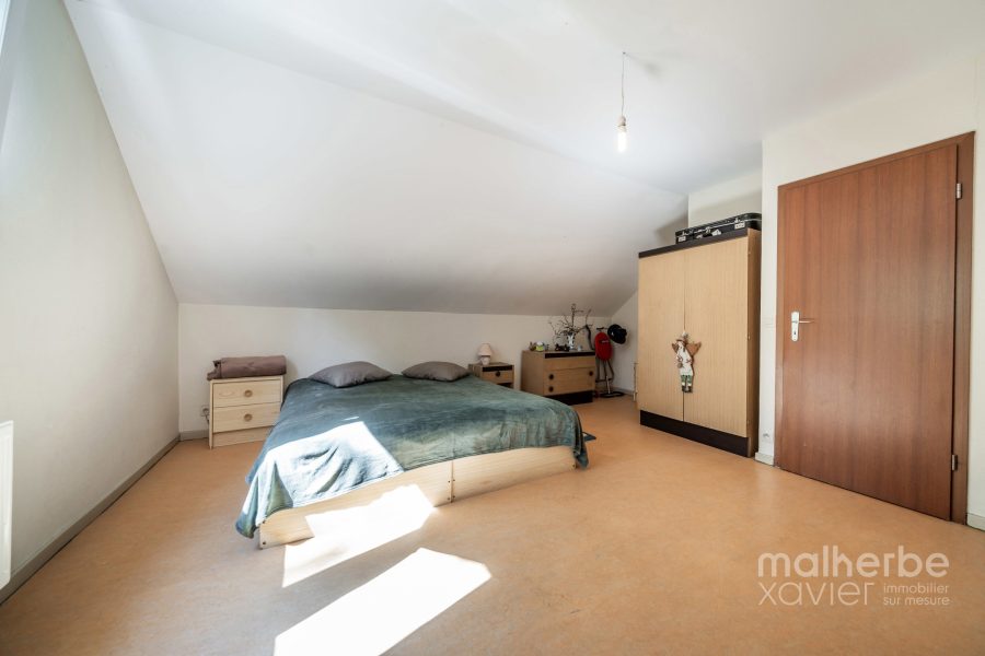À l’étage : hall de nuit, 2 chambres supplémentaires (16 et 22 m²), salle de bains avec baignoire, WC séparé et grenier de rangement.