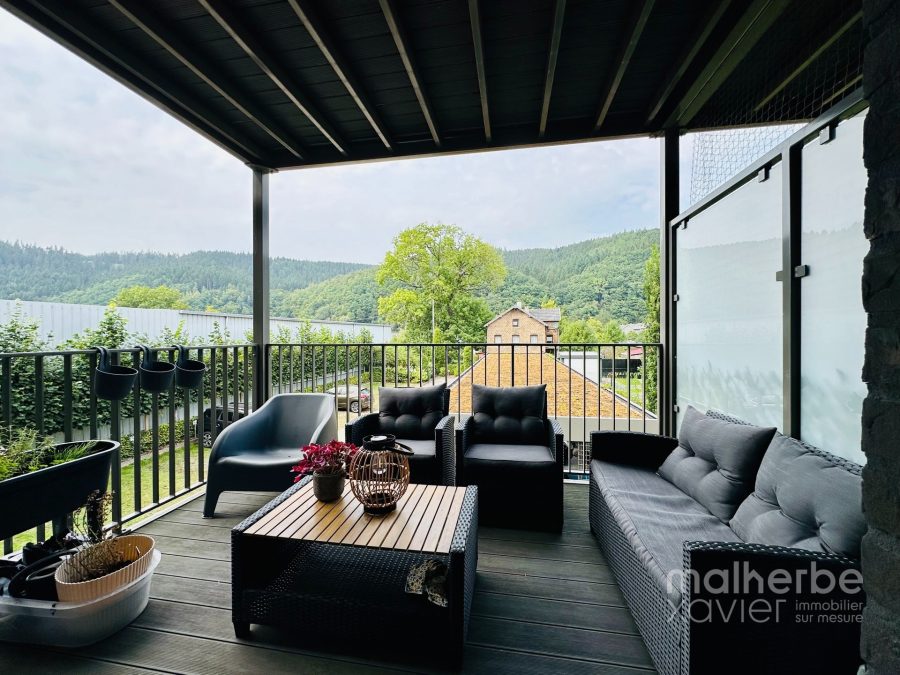 Living lumineux avec accès direct à une terrasse couverte orientée vers l’arrière (calme, côté parking)