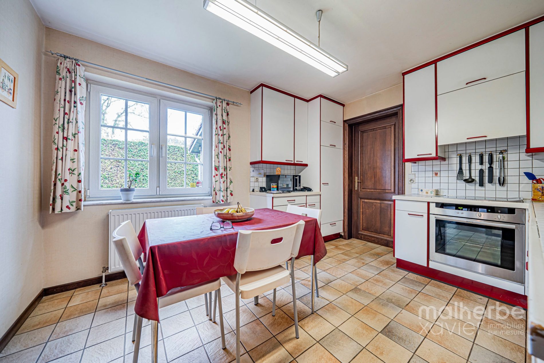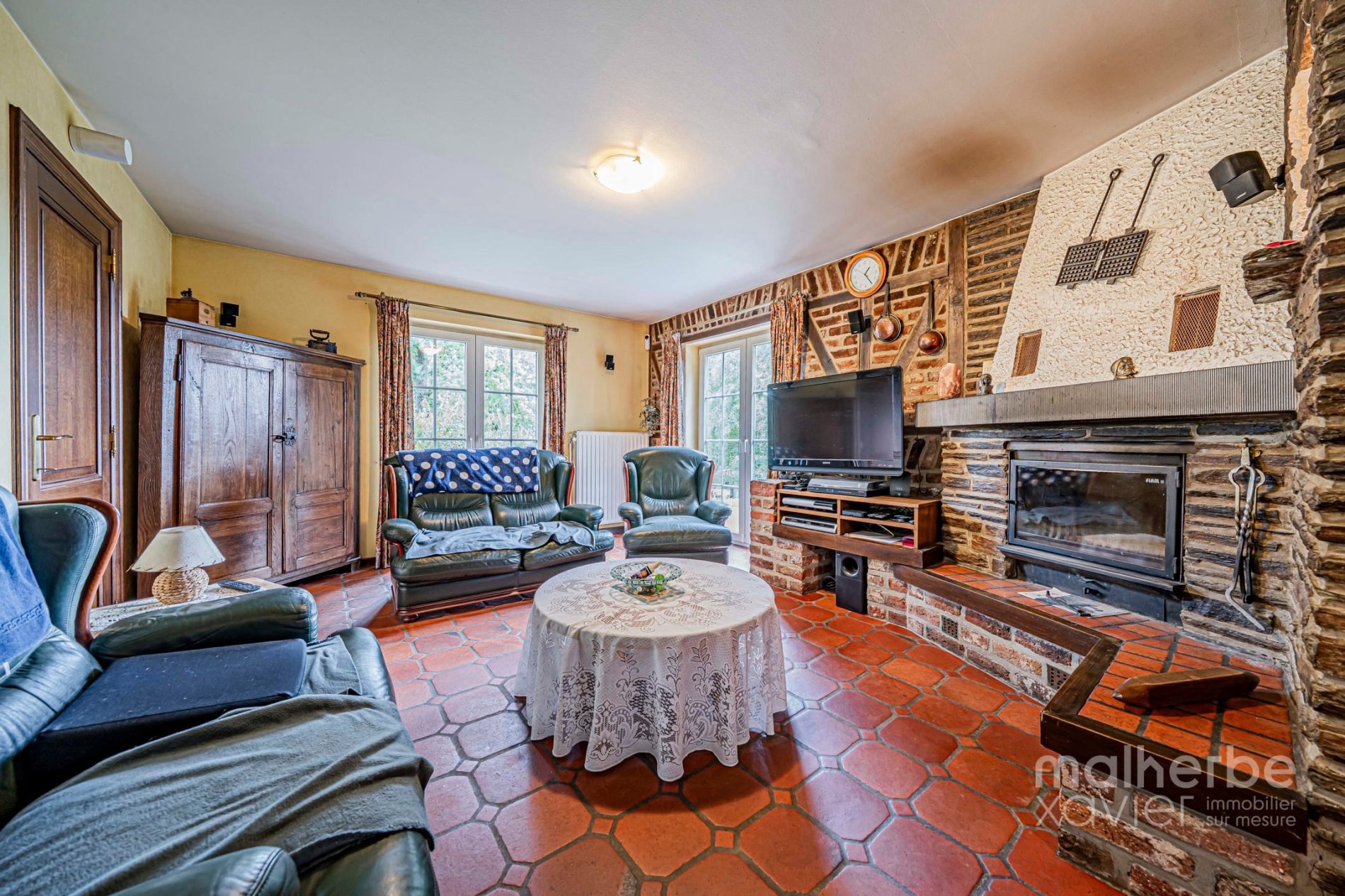 Finition soignée : châssis PVC double vitrage, sols carrelés et parquet, cuisine équipée