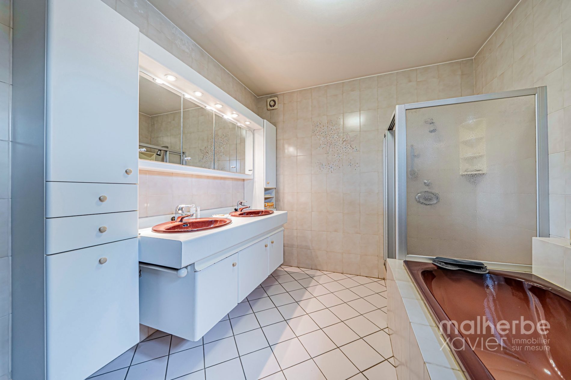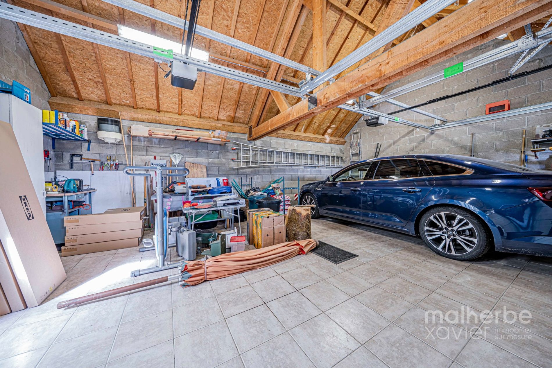 Double garage carrelé avec porte sectionnelle électrique.
