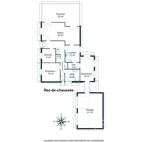 Hall d’entrée, spacieux séjour lumineux donnant accès à la terrasse, cuisine équipée, chambre principale, salle de bains (bain + douche), bureau, buanderie, WC, double garage.