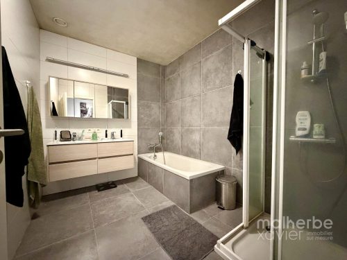 Trois chambres spacieuses donnant directement accès au jardin privatif, une salle de bain avec meuble double vasques et cabine de douche, un WC séparé, une cave et une seconde buanderie.