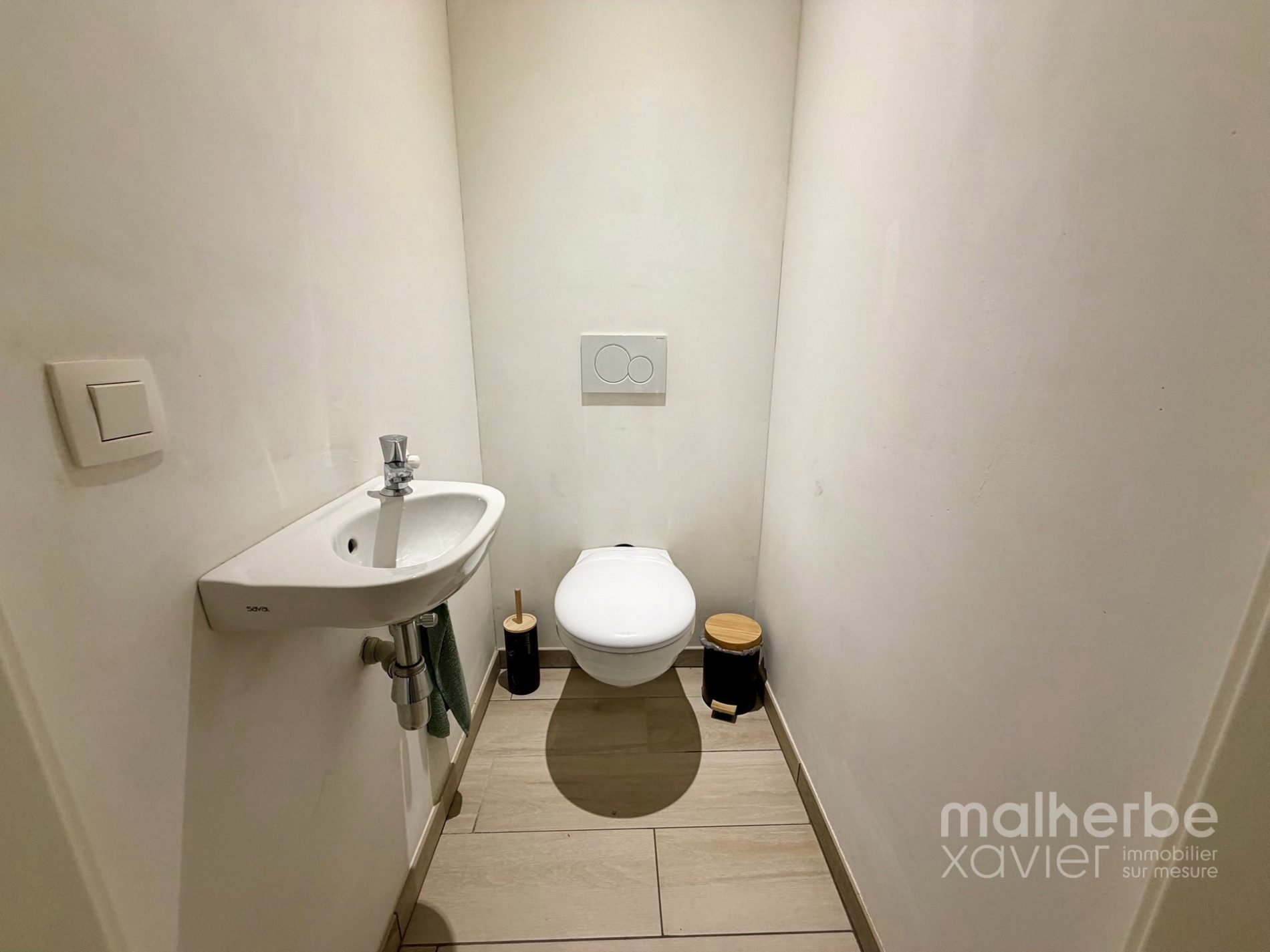 Trois chambres spacieuses donnant directement accès au jardin privatif, une salle de bain avec meuble double vasques et cabine de douche, un WC séparé, une cave et une seconde buanderie.