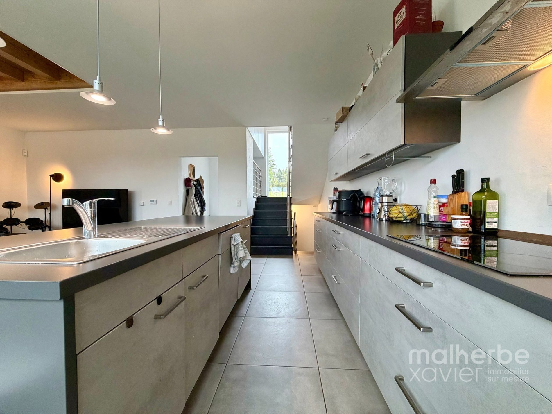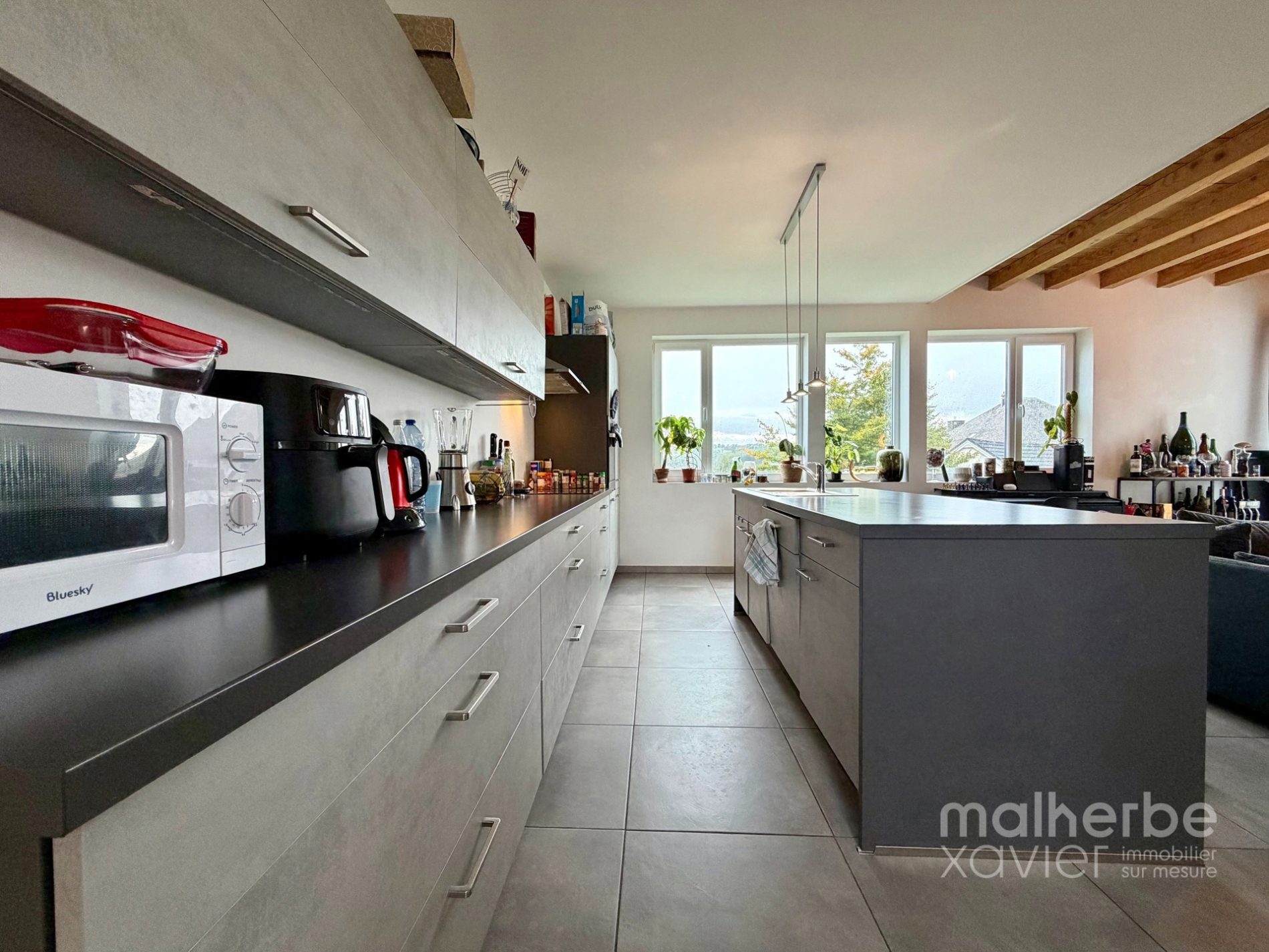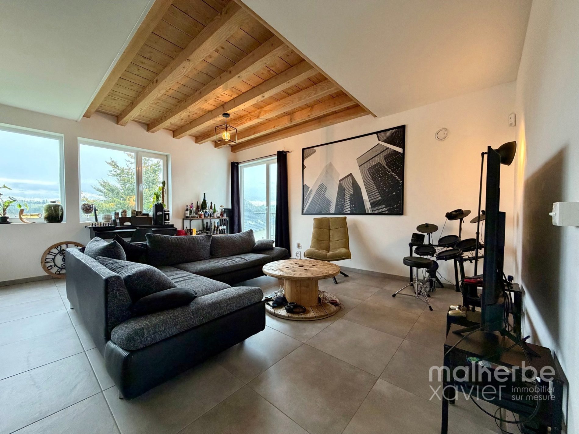 Grand salon lumineux avec accès à une terrasse “roof top” offrant une vue dégagée et imprenable sur les environs.