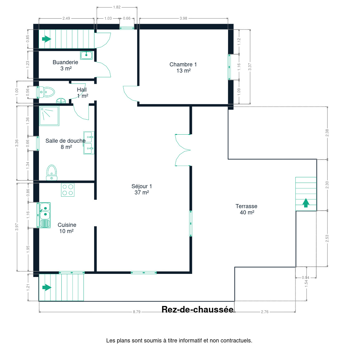 Rez-de-chaussée (±76 m²) : lumineux séjour cathédrale avec poêle à bois et accès terrasse, cuisine semi-équipée, chambre, salle de douche, WC et buanderie.