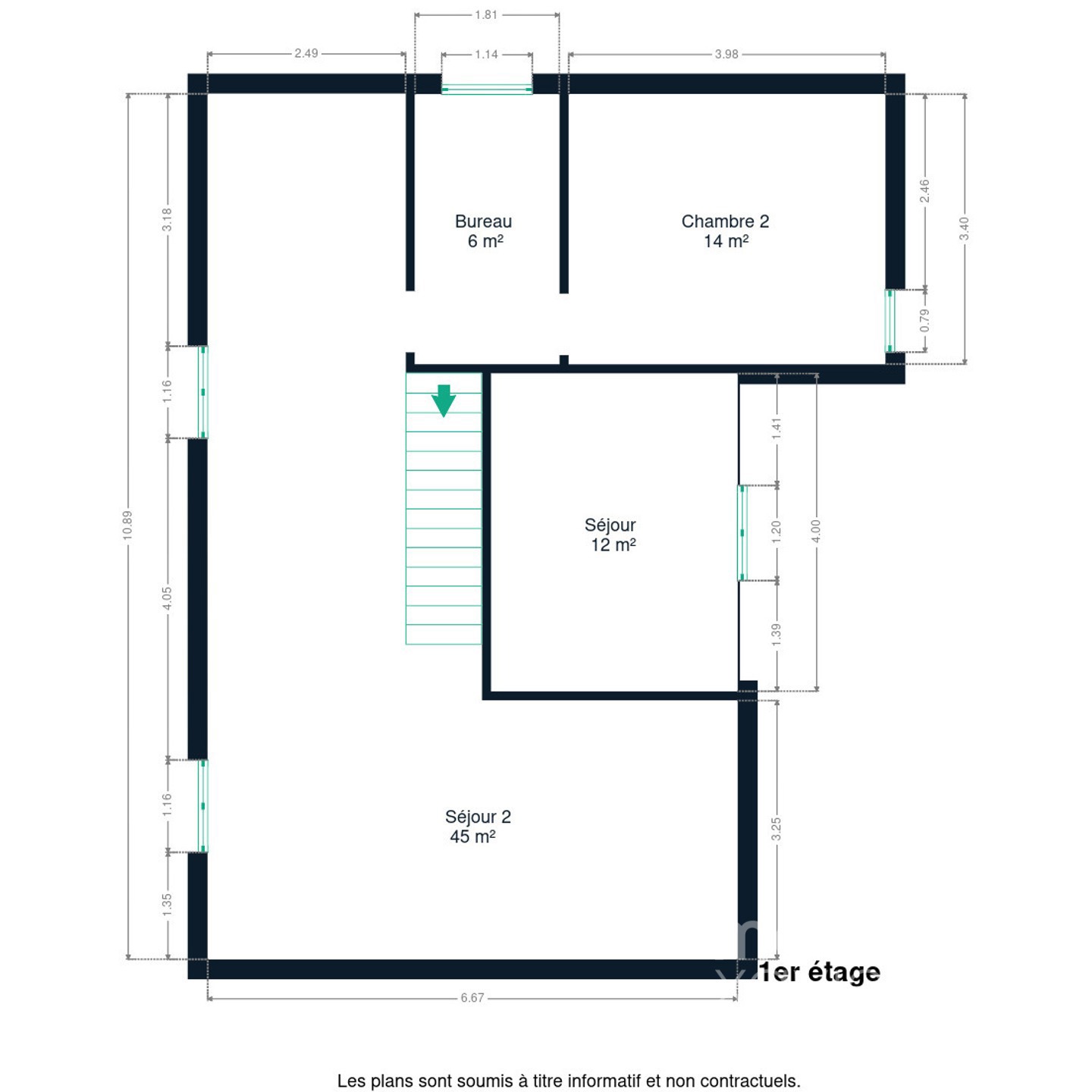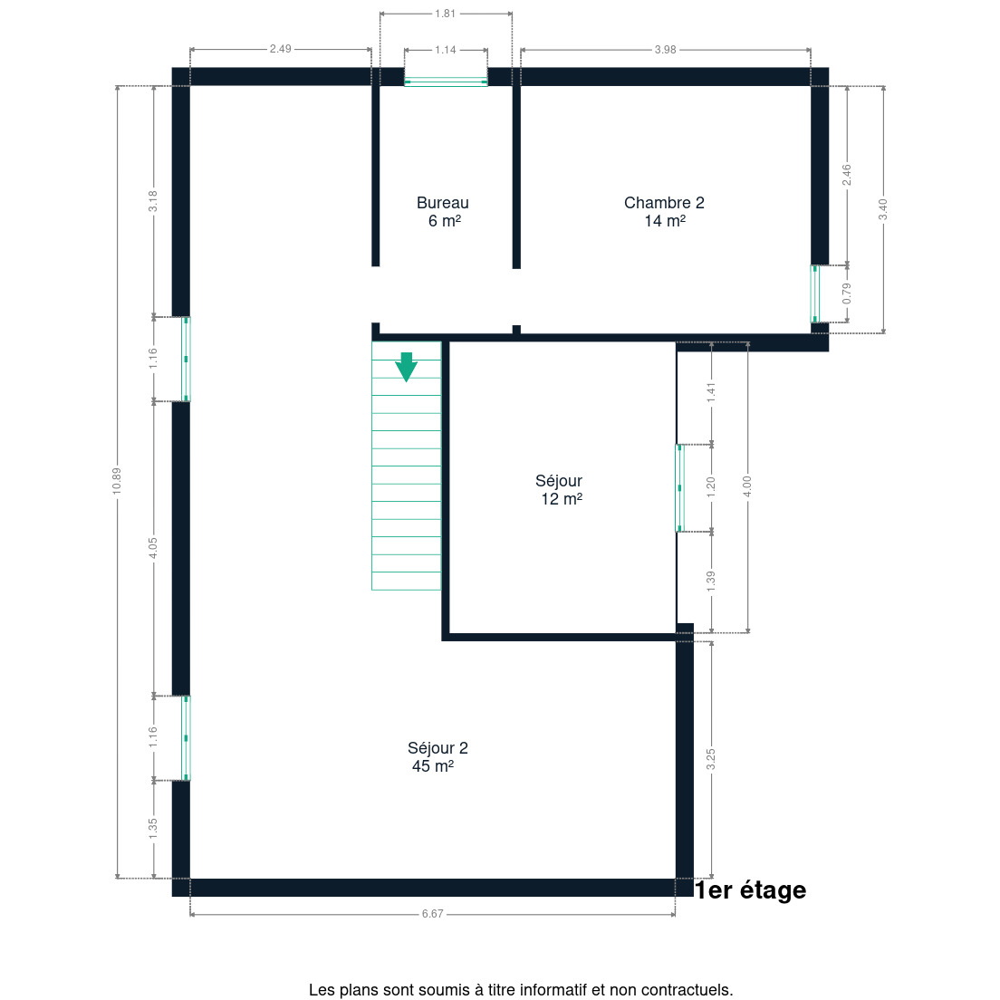 Étage (±64 m²) : second séjour, chambre, bureau.