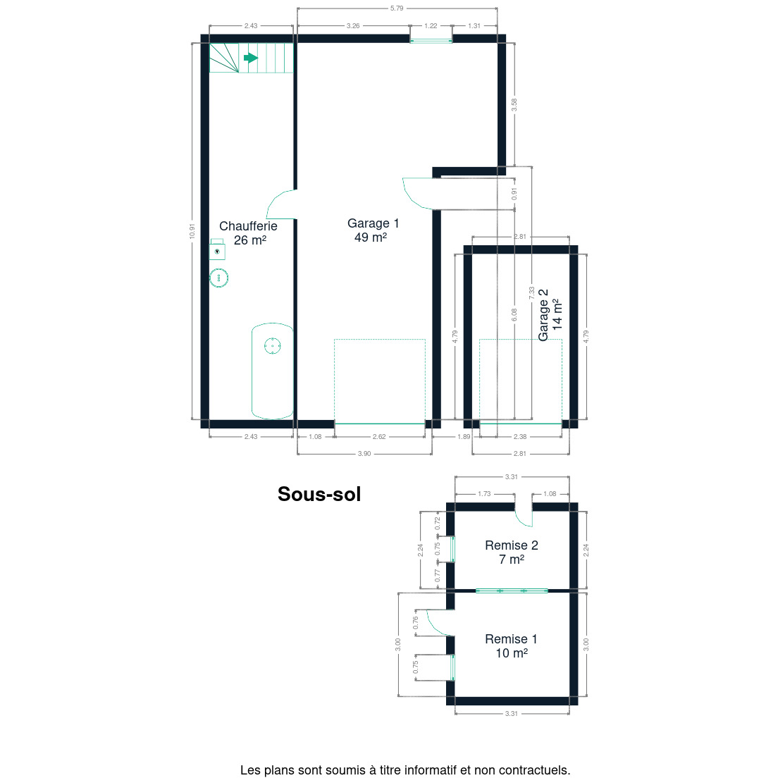 Sous-sol (±142 m²) : deux garages, chaufferie, remises et rangements.