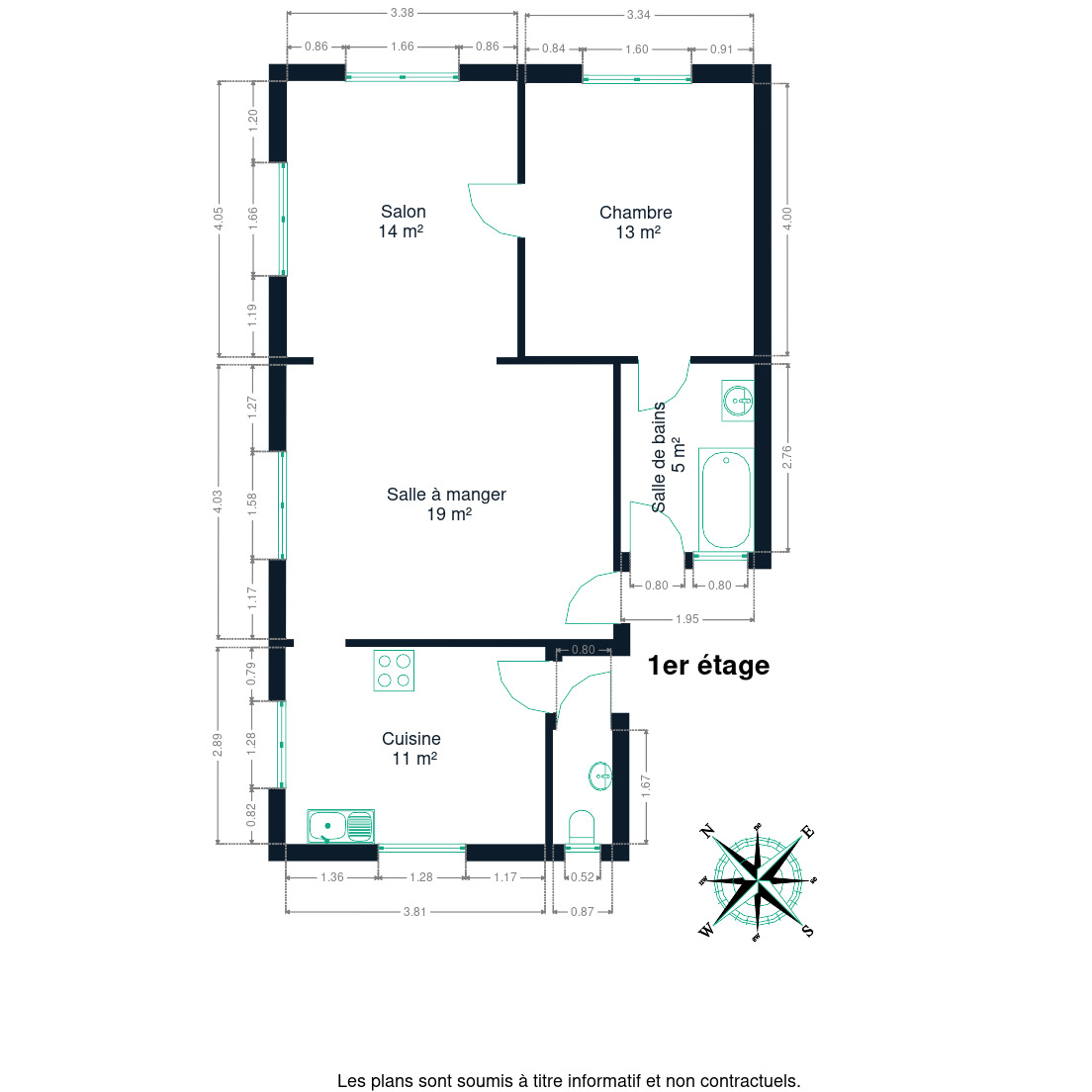 Disposition fonctionnelle, volumes corrects et belle luminosité grâce à la situation en façade sur la place.