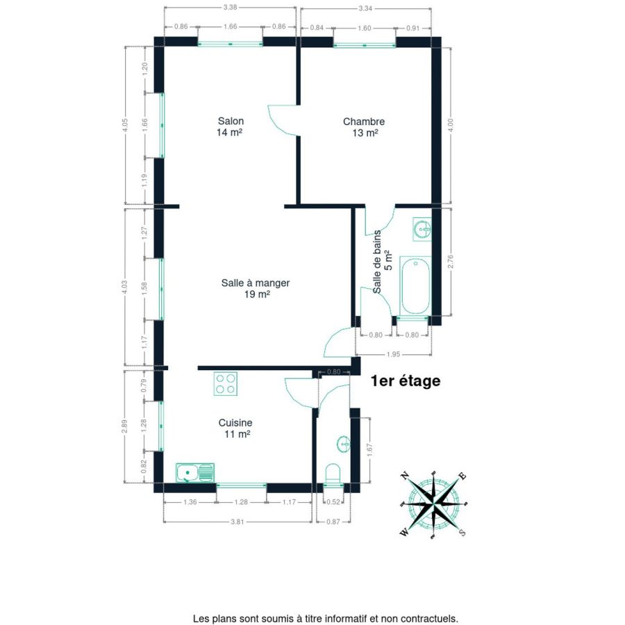 L’appartement se situe au 1er étage d’une copropriété de 4 unités et développe une surface habitable d’environ 64 m².