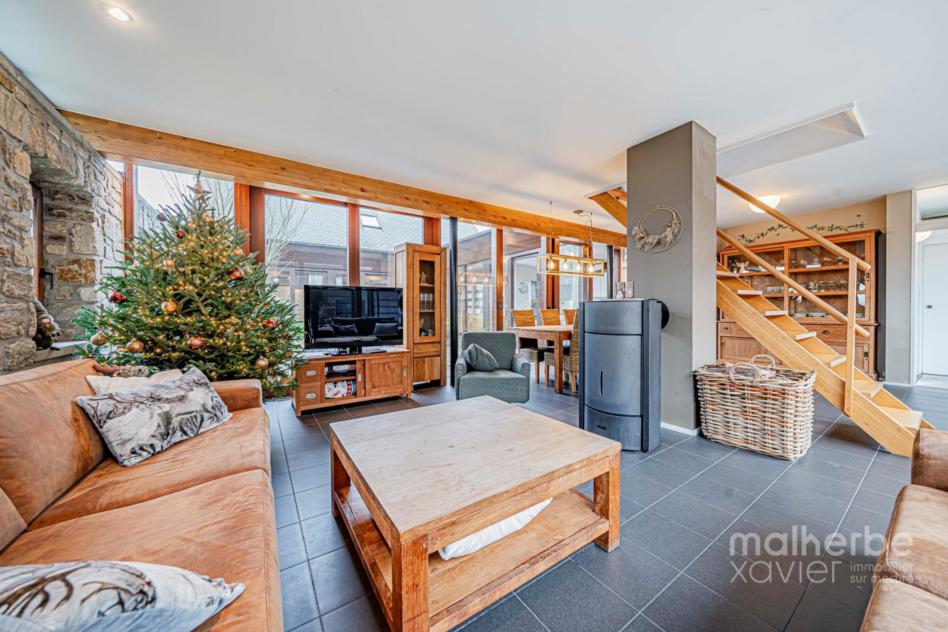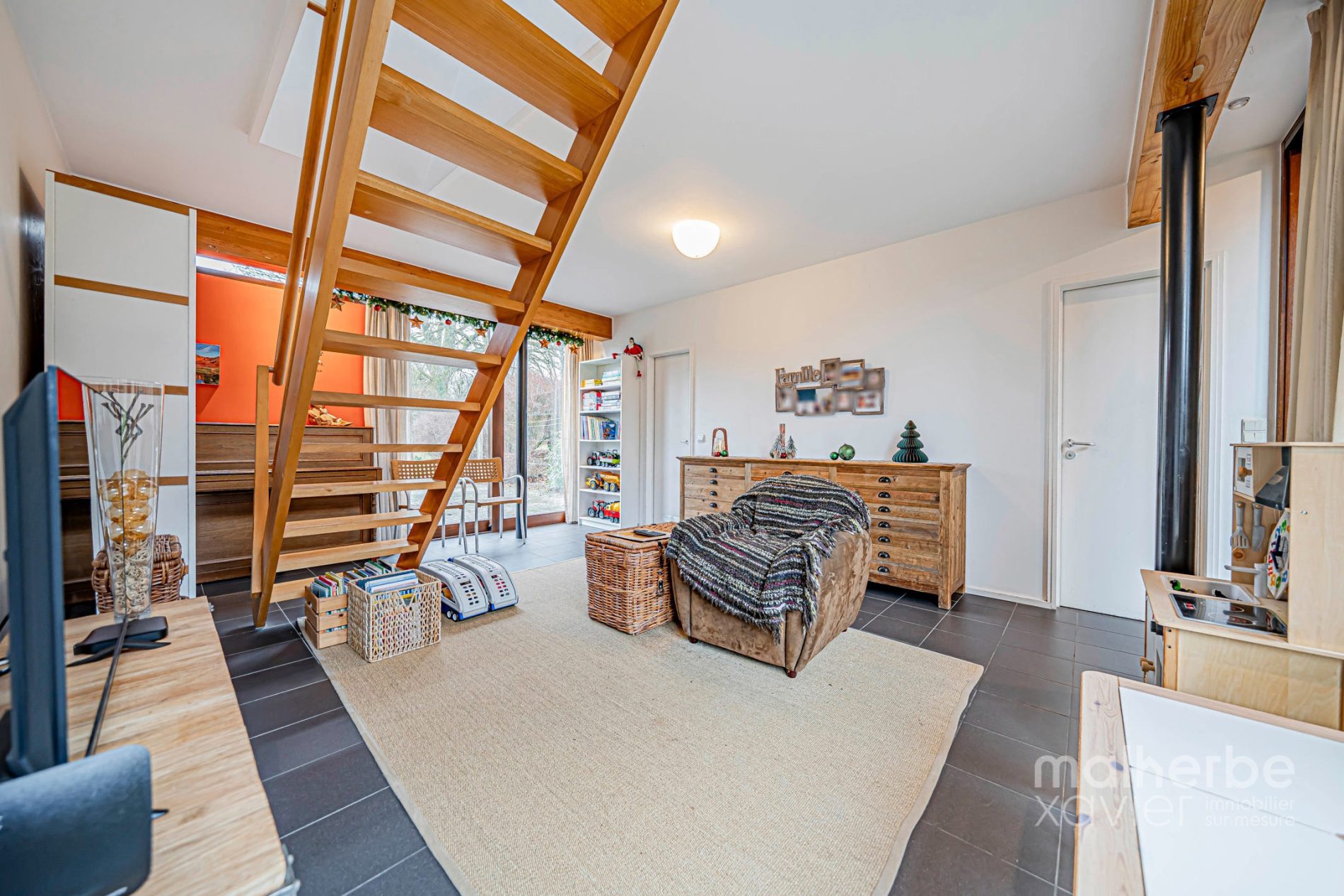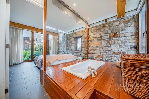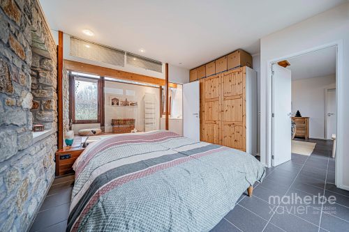 Les espaces de vie s’organisent autour de larges ouvertures vers les terrasses et le jardin. Le séjour, généreux et chaleureux, est équipé d’un poêle à bois et d’un chauffage par le sol, garantissant un confort optimal toute l’année.
