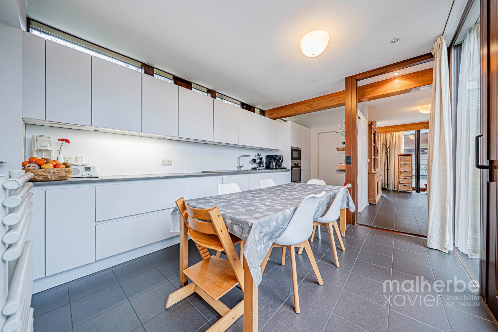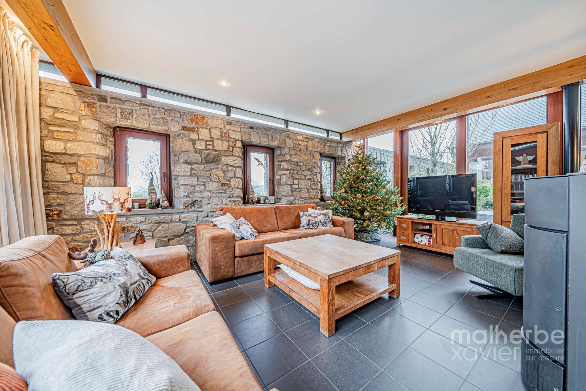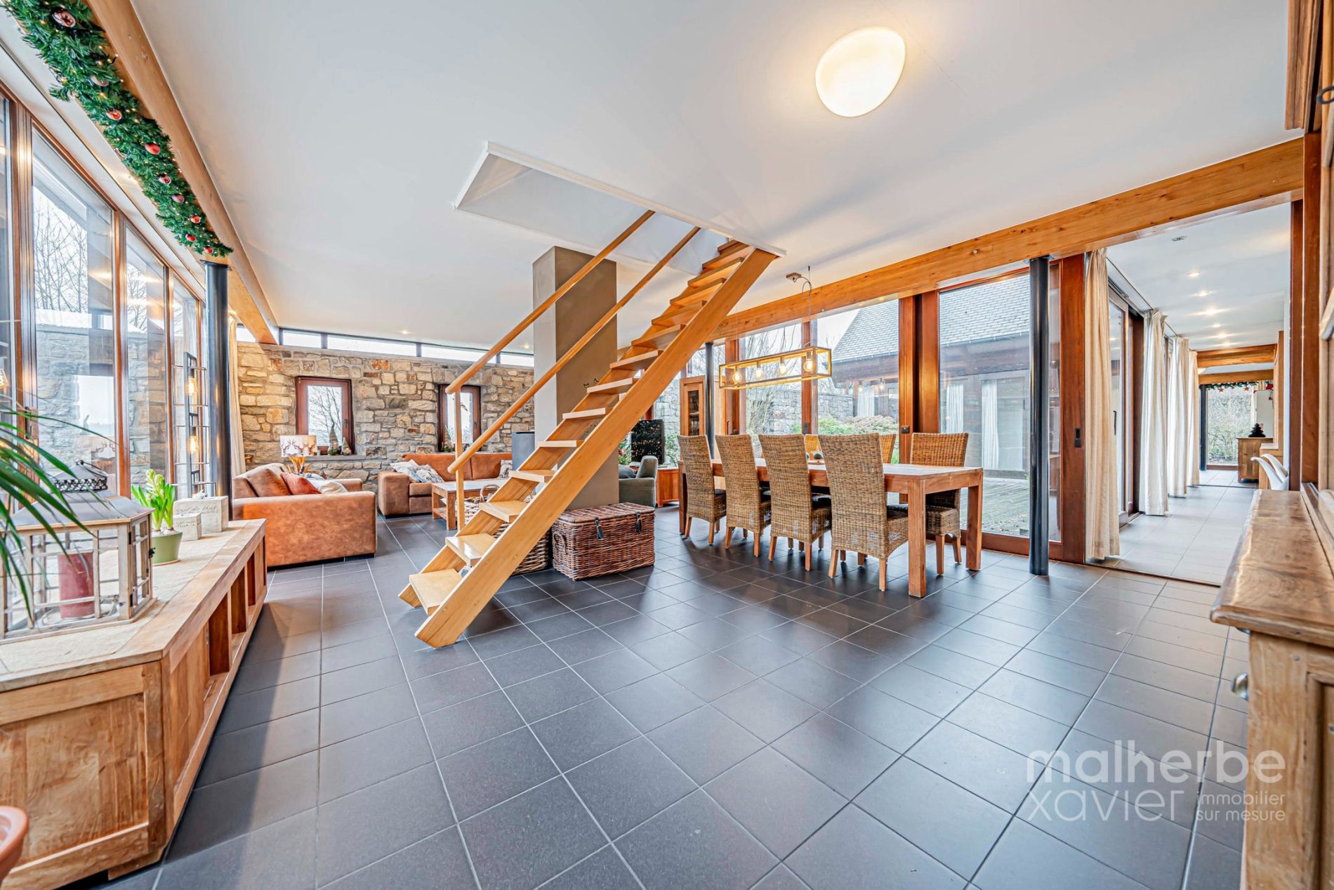 Les espaces de vie s’organisent autour de larges ouvertures vers les terrasses et le jardin. Le séjour, généreux et chaleureux, est équipé d’un poêle à bois et d’un chauffage par le sol, garantissant un confort optimal toute l’année.