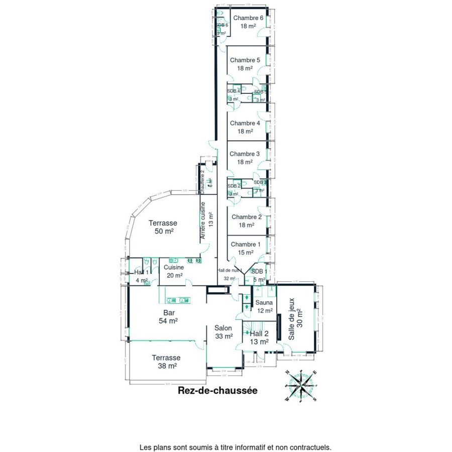 👉 14 chambres – 11 salles de bains – grands espaces communs – cuisine professionnelle – bar – salle à manger – sauna – jardin