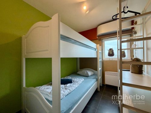 La cuisine équipée s’intègre harmonieusement à l’espace de vie, tandis que les trois chambres confortables, dont une configuration optimisée avec lits superposés, permettent d’accueillir plusieurs occupants sans compromis sur le confort.